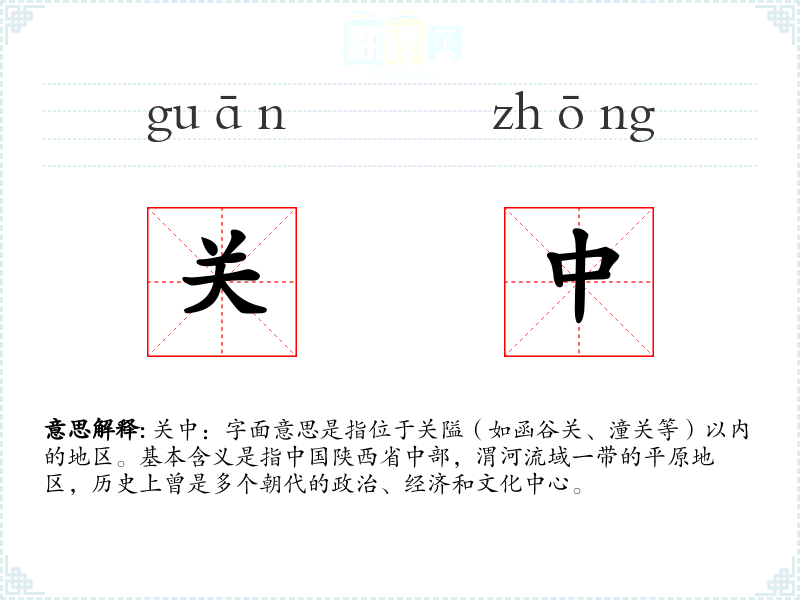 关中:字面意思是指位于关隘(如函谷关、潼关等)以内的地区。基本含义是指**陕西省中部,渭河流域一带的平原地区,历史上曾是多个朝代的政治、经济和文化中心。