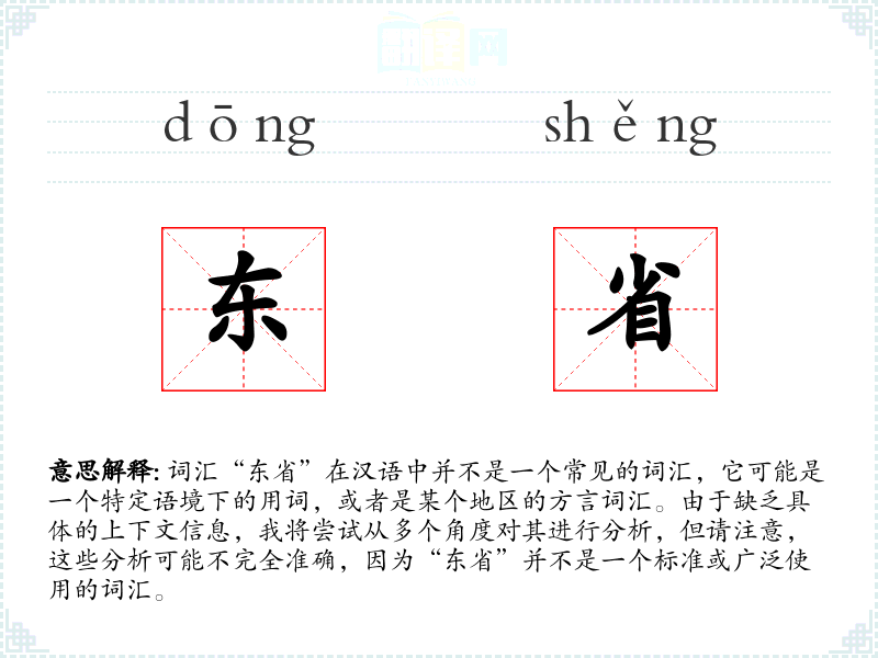 词汇“东省”在汉语中并不是一个常见的词汇,它可能是一个特定语境下的用词,或者是某个地区的方言词汇。由于缺乏具体的上下文信息,我将尝试从多个角度对其进行分析,但请注意,这些分析可能不完全准确,因为“东省”并不是一个标准或广泛使用的词汇。