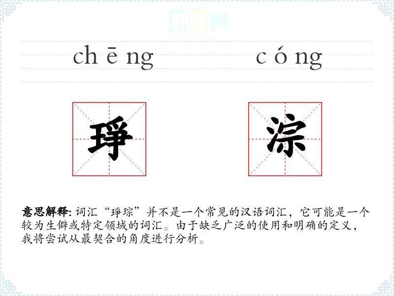 词汇“琤琮”并不是一个常见的汉语词汇,它可能是一个较为生僻或特定领域的词汇。由于缺乏广泛的使用和明确的定义,我将尝试从最契合的角度进行分析。