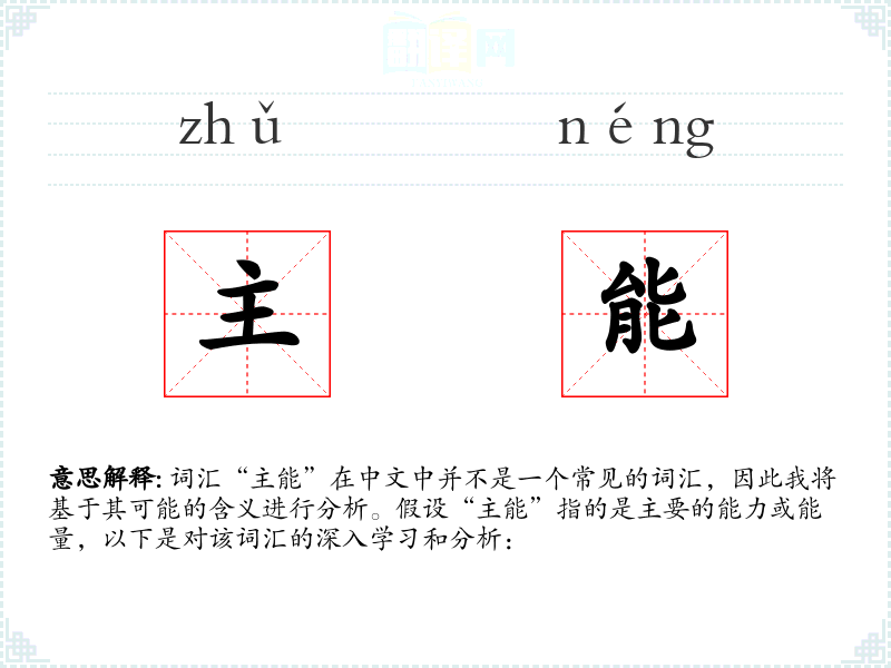 词汇“主能”在中文中并不是一个常见的词汇,因此我将基于其可能的含义进行分析。假设“主能”指的是主要的能力或能量,以下是对该词汇的深入学习和分析: