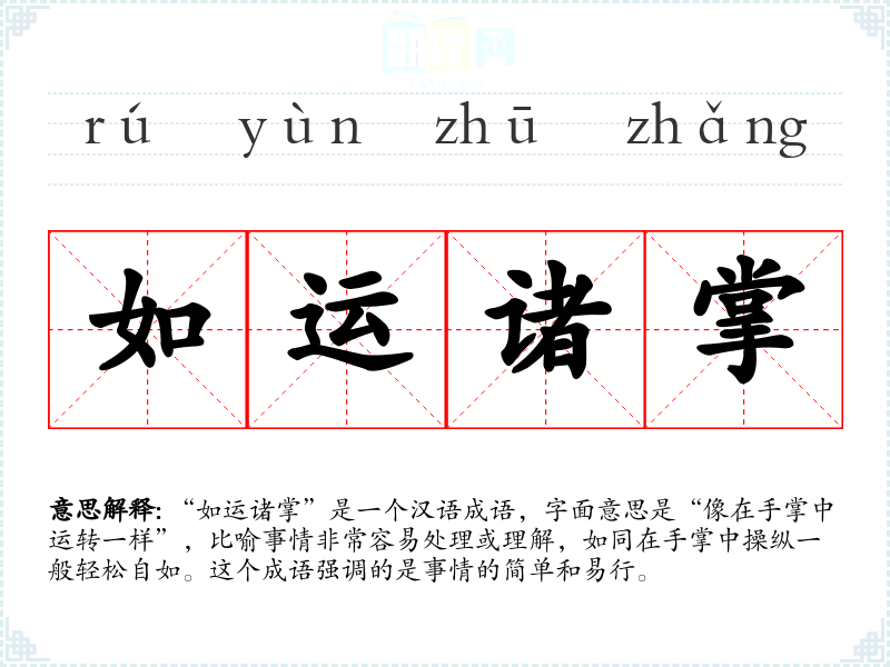 “如运诸掌”是一个汉语成语,字面意思是“像在手掌中运转一样”,比喻事情非常容易处理或理解,如同在手掌中操纵一般轻松自如。这个成语强调的是事情的简单和易行。