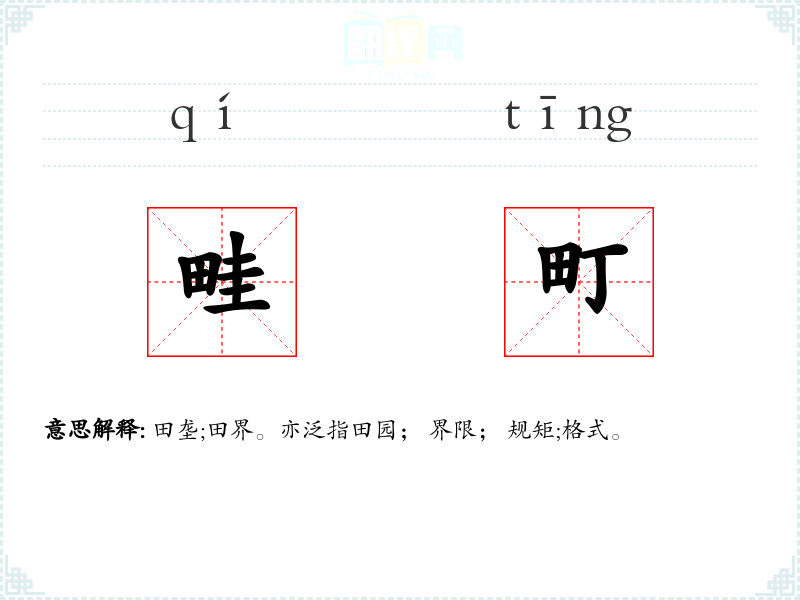 田垄;田界。亦泛指田园; 界限; 规矩;格式。