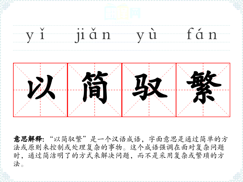 “以简驭繁”是一个汉语成语,字面意思是通过简单的方法或原则来控制或处理复杂的事物。这个成语强调在面对复杂问题时,通过简洁明了的方式来解决问题,而不是采用复杂或繁琐的方法。