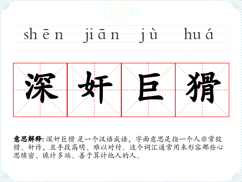 深奸巨猾 是一个汉语成语,字面意思是指一个人非常狡猾、奸诈,且手段高明、难以对付。这个词汇通常用来形容那些心思缜密、诡计多端、善于算计他人的人。