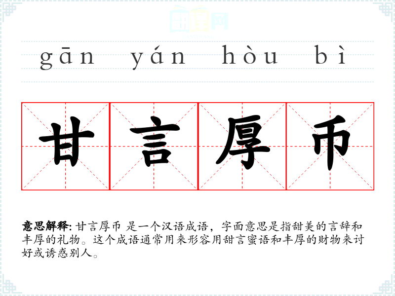 甘言厚币 是一个汉语成语,字面意思是指甜美的言辞和丰厚的礼物。这个成语通常用来形容用甜言蜜语和丰厚的财物来讨好或诱惑别人。