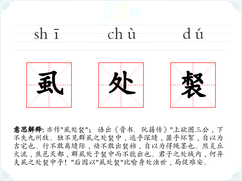 1.亦作"虱处裻"; 语出《晋书.阮籍传》"上欲图三公﹐下不失九州牧。独不见群虱之处裻中﹐逃乎深缝﹐匿乎坏絮﹐自以为吉宅也。行不敢离缝际﹐动不敢出裻裆﹐自以为得绳墨也。然炎丘火流﹐焦邑灭都﹐群虱处于裻中而不能出也。君子之处域内﹐何异夫虱之处裻中乎!"后因以"虱处裻"比喻身处浊世﹐局促难安。