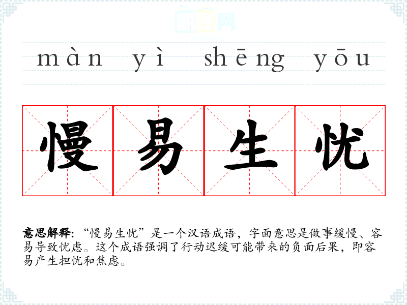 “慢易生忧”是一个汉语成语,字面意思是做事缓慢、容易导致忧虑。这个成语强调了行动迟缓可能带来的负面后果,即容易产生担忧和焦虑。