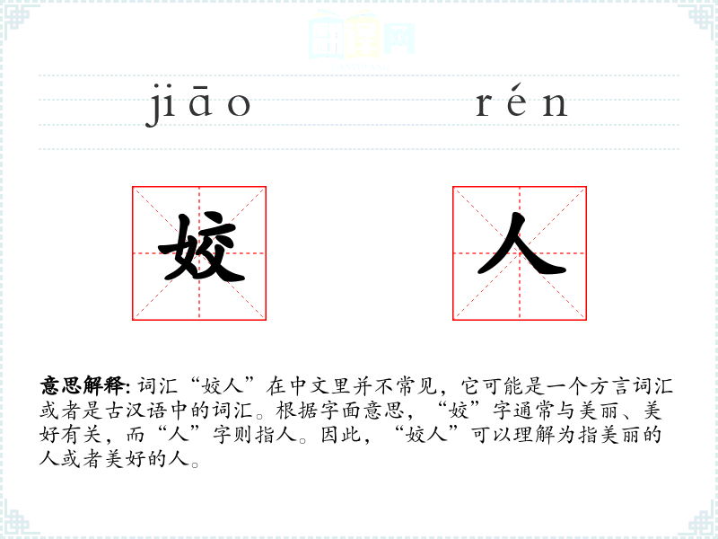 词汇“姣人”在中文里并不常见,它可能是一个方言词汇或者是古汉语中的词汇。根据字面意思,“姣”字通常与美丽、美好有关,而“人”字则指人。因此,“姣人”可以理解为指美丽的人或者美好的人。