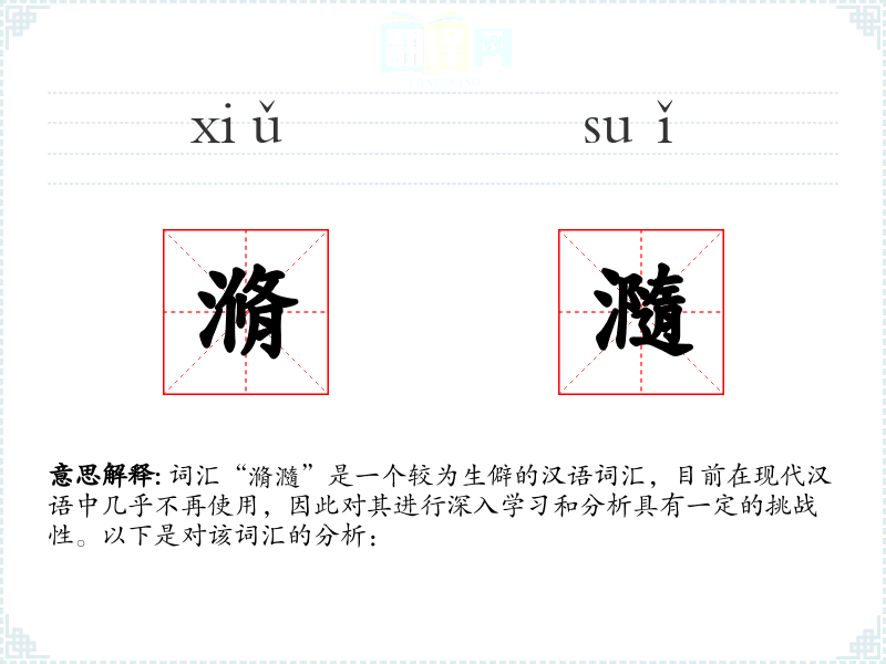词汇“滫瀡”是一个较为生僻的汉语词汇,目前在现代汉语中几乎不再使用,因此对其进行深入学*和分析具有一定的挑战性。以下是对该词汇的分析:
