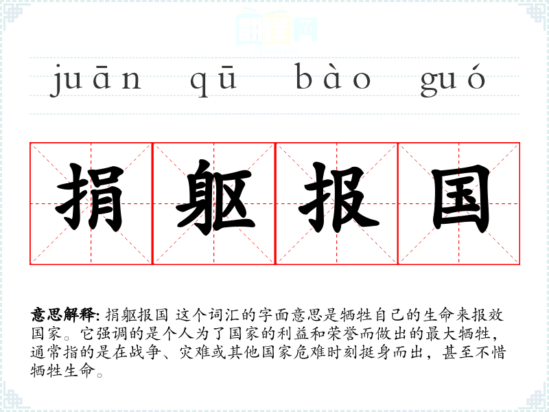 捐躯报国 这个词汇的字面意思是牺牲自己的生命来报效国家。它强调的是个人为了国家的利益和荣誉而做出的最大牺牲,通常指的是在战争、灾难或其他国家危难时刻挺身而出,甚至不惜牺牲生命。