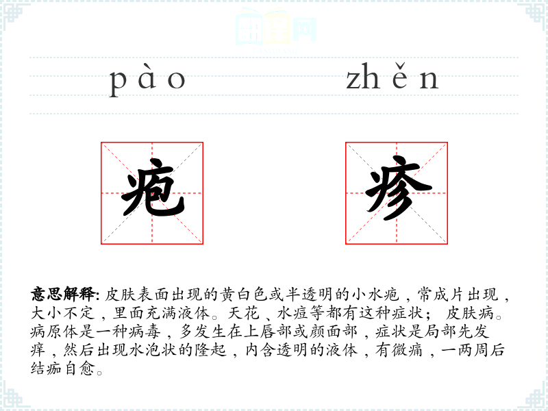 1.皮肤表面出现的黄白色或半透明的小水疱﹐常成片出现﹐大小不定﹐里面充满液体。天花﹑水痘等都有这种症状; 皮肤病。病原体是一种病毒﹐多发生在上唇部或颜面部﹐症状是局部先发痒﹐然后出现水泡状的隆起﹐内含透明的液体﹐有微痛﹐一两周后结痂自愈。