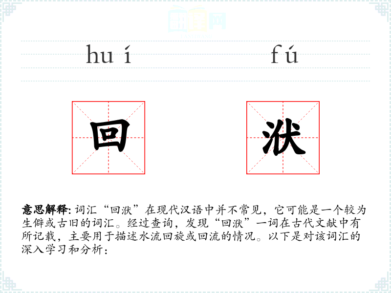 词汇“回洑”在现代汉语中并不常见,它可能是一个较为生僻或古旧的词汇。经过查询,发现“回洑”一词在古代文献中有所记载,主要用于描述水流回旋或回流的情况。以下是对该词汇的深入学习和分析: