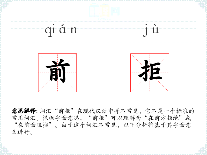 词汇“前拒”在现代汉语中并不常见,它不是一个标准的常用词汇。根据字面意思,“前拒”可以理解为“在前方拒绝”或“在前面阻挡”。由于这个词汇不常见,以下分析将基于其字面意义进行。