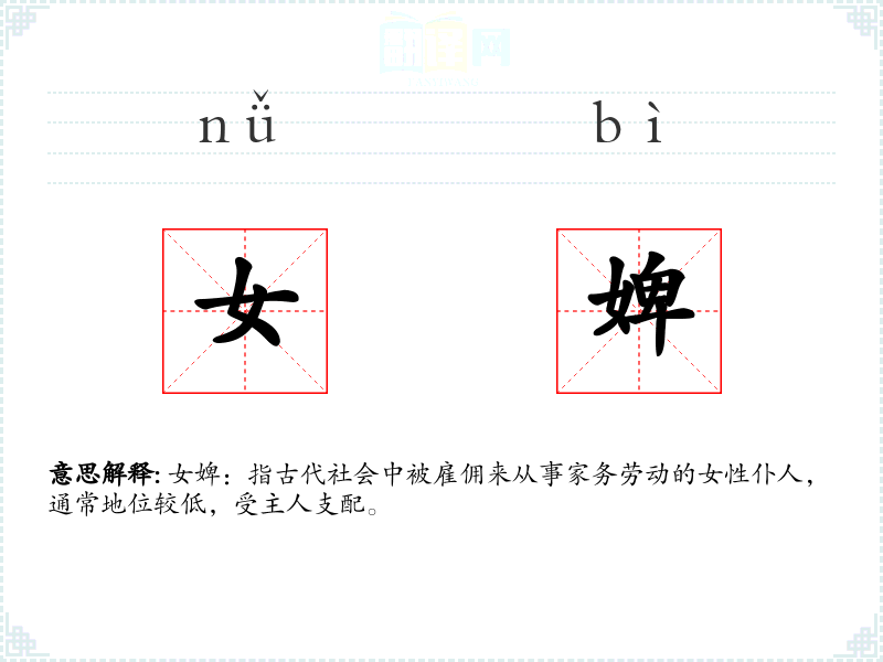 - 词源:“女婢”一词源自古代汉语,由“女”和“婢”组成,“婢”字本身就有仆人的意思。