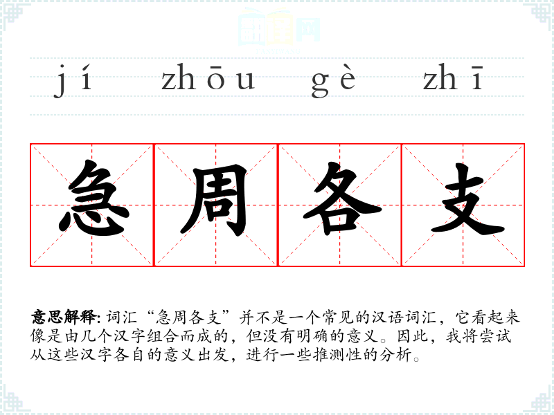 词汇“急周各支”并不是一个常见的汉语词汇,它看起来像是由几个汉字组合而成的,但没有明确的意义。因此,我将尝试从这些汉字各自的意义出发,进行一些推测性的分析。