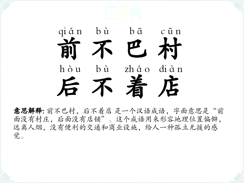 前不巴村,后不着店 是一个汉语成语,字面意思是“前面没有村庄,后面没有店铺”。这个成语用来形容地理位置偏僻,远离人烟,没有便利的交通和商业设施,给人一种孤立无援的感觉。