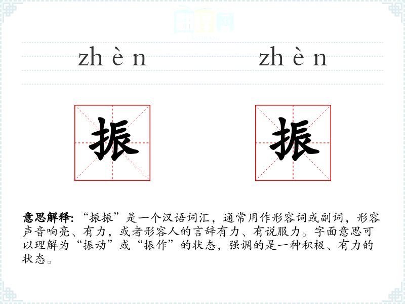 “振振”是一个富有表现力的词汇,能够有效地传达声音或言辞的响亮和有力。在语言学*和表达中,正确使用“振振”可以增强语言的生动性和说服力。