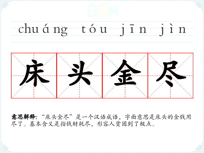 “床头金尽”最早见于唐代诗人杜甫的诗作,后来逐渐成为常用成语。在古代,床头常放置钱财,因此“床头金尽”形象地表达了钱财耗尽的状态。