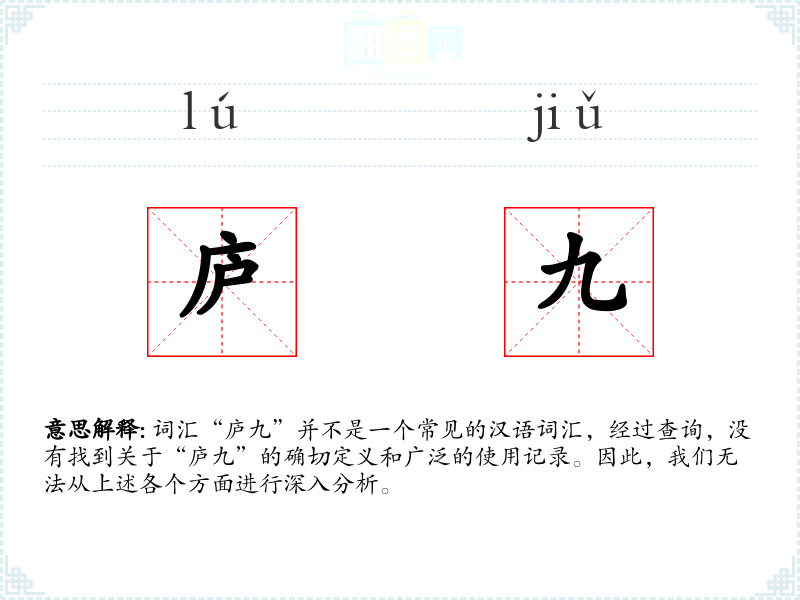 然而,如果我们从字面意思来推测,“庐”通常指的是简陋的房屋,而“九”是一个数字,常用来表示多数或极限。结合起来,“庐九”可能指的是很多简陋的房屋,或者某种与房屋有关的极限情况。