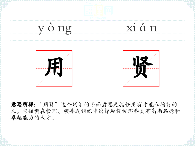 在中国传统文化中,“用贤”是一个非常重要的概念,它体现了儒家思想中的“贤人政治”理念。在现代社会,这个词汇仍然被用来强调公平、公正和效率的用人原则。