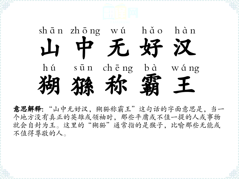 - shān zhōng wú hǎo hàn,hú sūn chēng bà wáng山中无好汉,猢猻称霸王