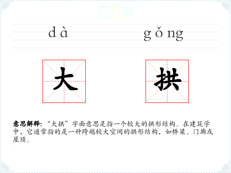 “大拱”字面意思是指一个较大的拱形结构。在建筑学中,它通常指的是一种跨越较大空间的拱形结构,如桥梁、门廊或屋顶。