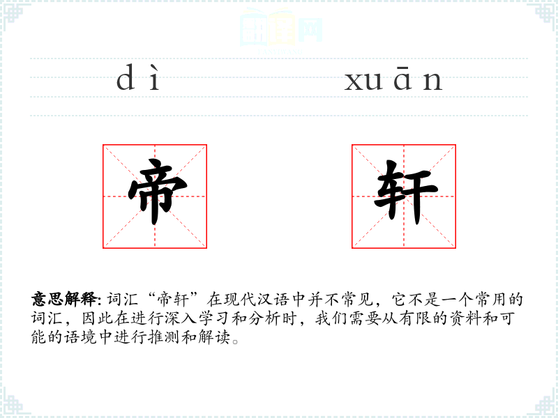 词汇“帝轩”在现代汉语中并不常见,它不是一个常用的词汇,因此在进行深入学*和分析时,我们需要从有限的资料和可能的语境中进行推测和解读。