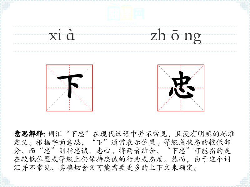 由于“下忠”不是一个常用词汇,其词源和演变历史不详。通常,“忠”字在**文化中有着悠久的历史,与忠诚、忠心的概念紧密相关。