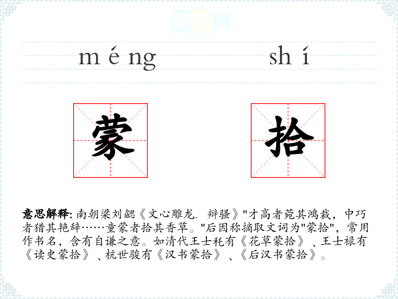 南朝梁刘勰《文心雕龙.辩骚》"才高者菀其鸿裁,中巧者猎其艳辞……童蒙者拾其香草。"后因称摘取文词为"蒙拾",常用作书名,含有自谦之意。如清代王士秅有《花草蒙拾》﹑王士禄有《读史蒙拾》﹑杭世骏有《汉书蒙拾》﹑《后汉书蒙拾》。