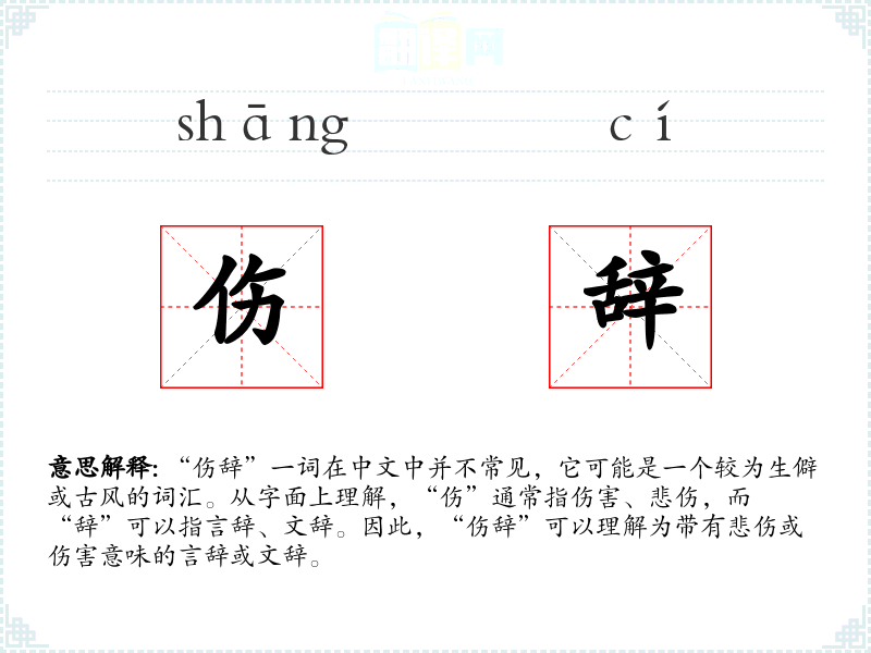 “伤辞”一词在中文中并不常见,它可能是一个较为生僻或古风的词汇。从字面上理解,“伤”通常指伤害、悲伤,而“辞”可以指言辞、文辞。因此,“伤辞”可以理解为带有悲伤或伤害意味的言辞或文辞。