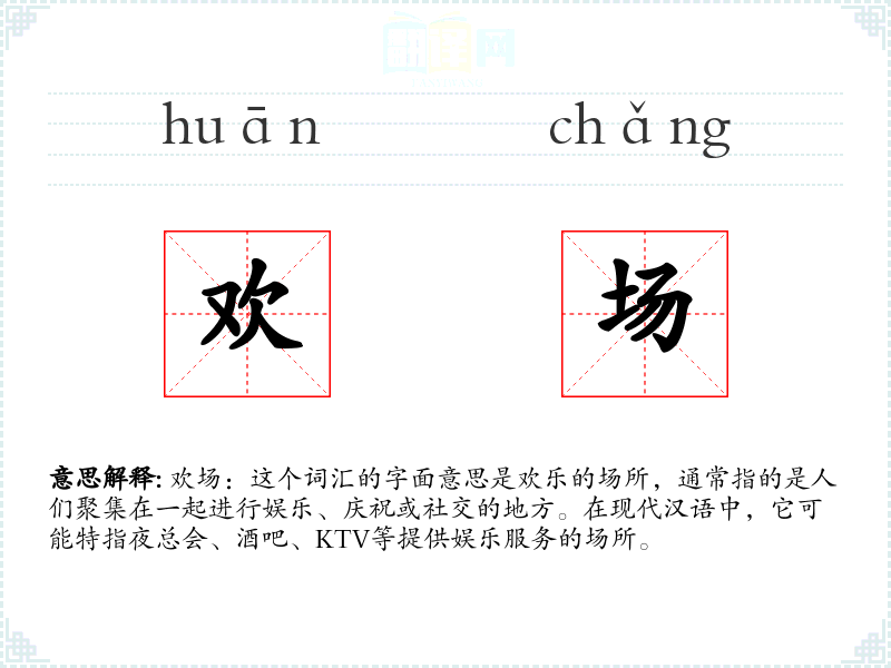 欢场:这个词汇的字面意思是欢乐的场所,通常指的是人们聚集在一起进行娱乐、庆祝或社交的地方。在现代汉语中,它可能特指夜总会、酒吧、KTV等提供娱乐服务的场所。