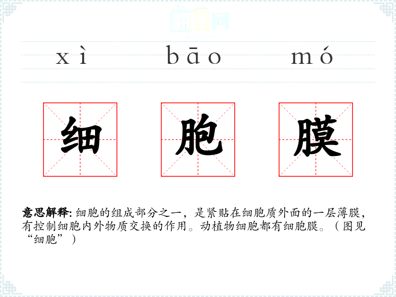 细胞的组成部分之一,是紧贴在细胞质外面的一层薄膜,有控制细胞内外物质交换的作用。动植物细胞都有细胞膜。(图见“细胞”)
