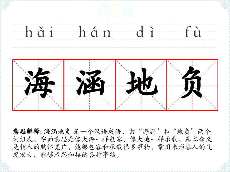海涵地负 是一个汉语成语,由“海涵”和“地负”两个词组成。字面意思是像大海一样包容,像大地一样承载。基本含义是指人的胸怀宽广,能够包容和承载很多事物,常用来形容人的气度宏大,能够容忍和接纳各种事物。