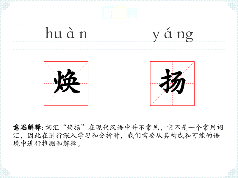 词汇“焕扬”在现代汉语中并不常见,它不是一个常用词汇,因此在进行深入学习和分析时,我们需要从其构成和可能的语境中进行推测和解释。