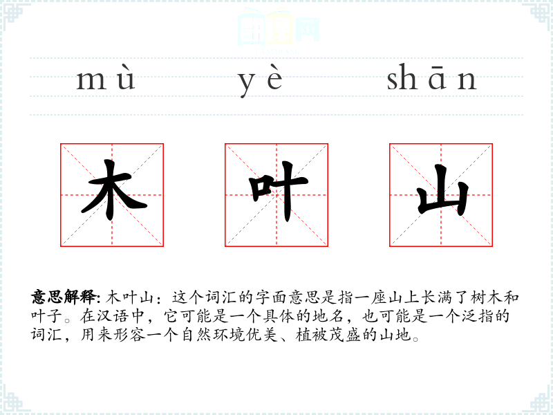 木叶山:这个词汇的字面意思是指一座山上长满了树木和叶子。在汉语中,它可能是一个具体的地名,也可能是一个泛指的词汇,用来形容一个自然环境优美、植被茂盛的山地。