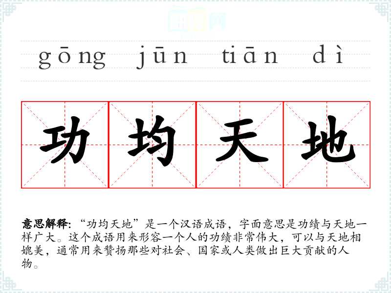 “功均天地”是一个汉语成语,字面意思是功绩与天地一样广大。这个成语用来形容一个人的功绩非常伟大,可以与天地相媲美,通常用来赞扬那些对社会、国家或人类做出巨大贡献的人物。