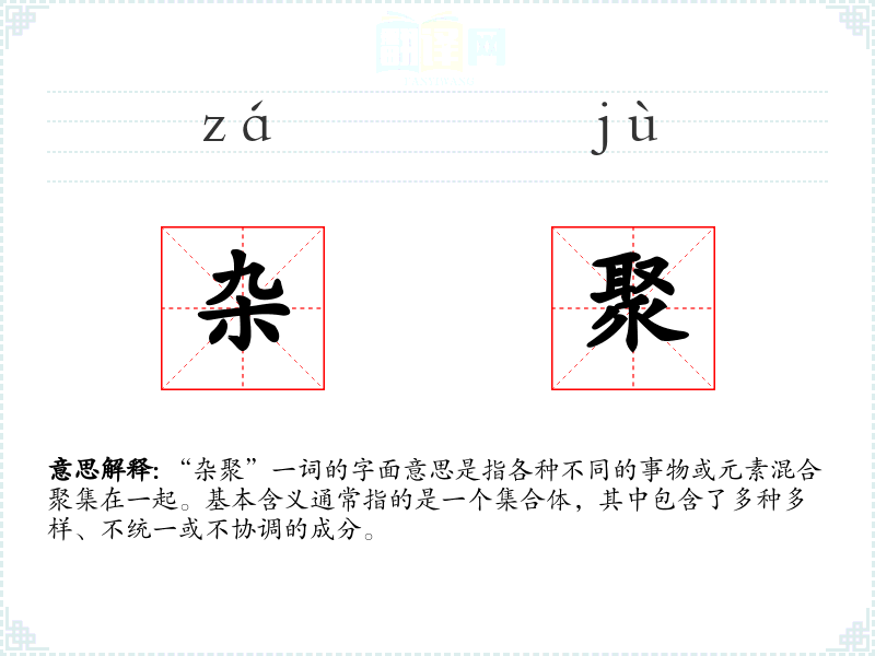 “杂聚”一词的字面意思是指各种不同的事物或元素混合聚集在一起。基本含义通常指的是一个集合体,其中包含了多种多样、不统一或不协调的成分。