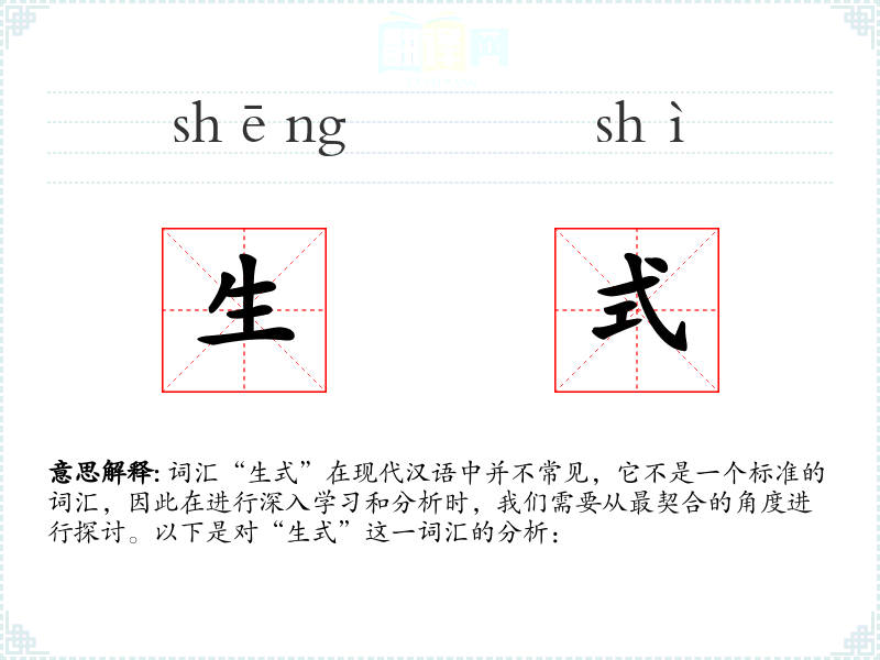 “生式”不是一个标准的汉语词汇,因此没有明确的字面意思和基本含义。它可能是由“生”和“式”两个字组合而成,但这种组合在标准汉语中没有特定的意义。