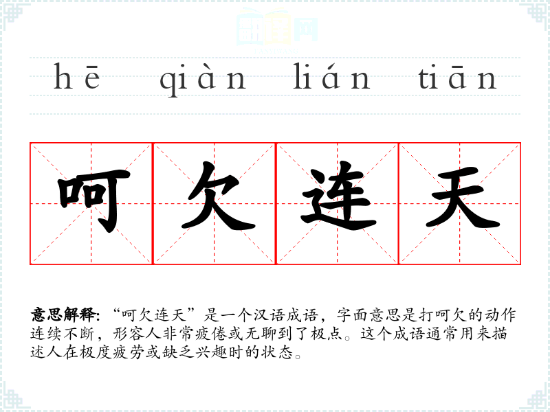 “呵欠连天”是一个汉语成语,字面意思是打呵欠的动作连续不断,形容人非常疲倦或无聊到了极点。这个成语通常用来描述人在极度疲劳或缺乏兴趣时的状态。