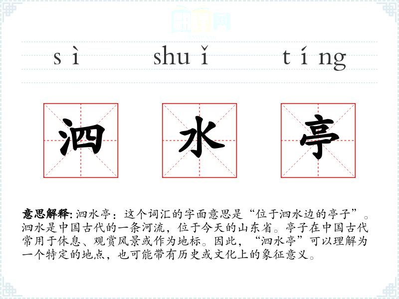 泗水亭:这个词汇的字面意思是“位于泗水边的亭子”。泗水是古代的一条河流,位于今天的山东省。亭子在古代常用于休息、观赏风景或作为地标。因此,“泗水亭”可以理解为一个特定的地点,也可能带有历史或文化上的象征意义。