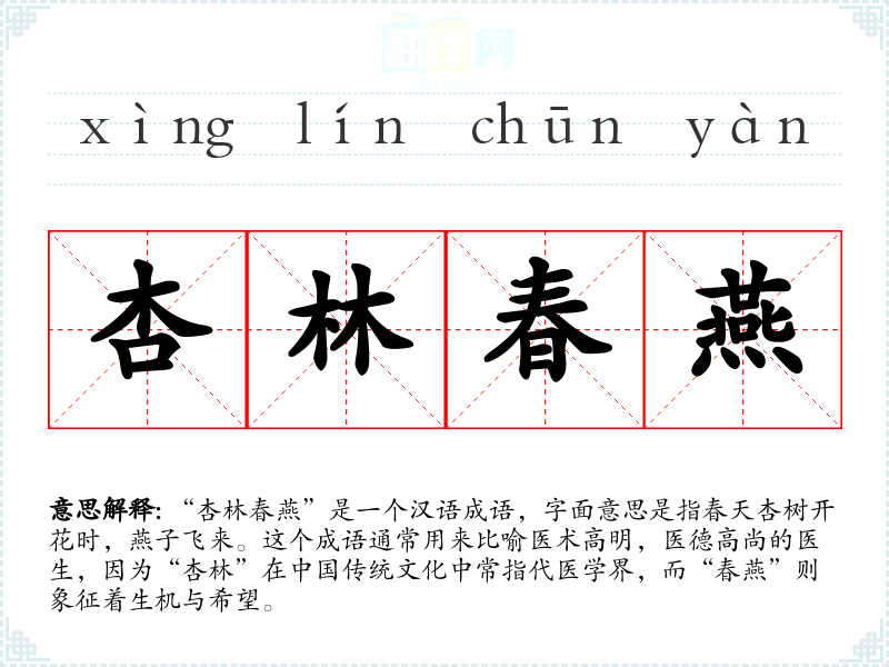 “杏林”一词源自《左传·僖公二十七年》,其中提到“杏林”为医家之地。后来,“杏林”逐渐成为医学界的代称。而“春燕”则因其春天归来,象征新生和希望,与“杏林”结合,形成了“杏林春燕”这一成语,用以赞美医术高超、医德高尚的医生。