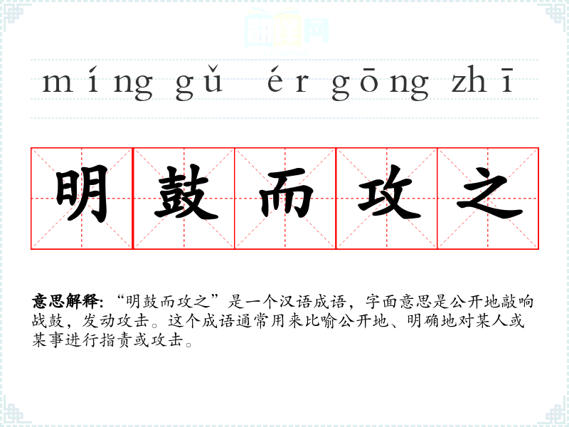 “明鼓而攻之”是一个汉语成语,字面意思是公开地敲响战鼓,发动攻击。这个成语通常用来比喻公开地、明确地对某人或某事进行指责或攻击。