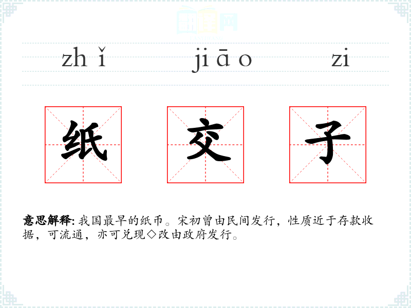 我国最早的纸币。宋初曾由民间发行,性质近于存款收据,可流通,亦可兑现◇改由政府发行。