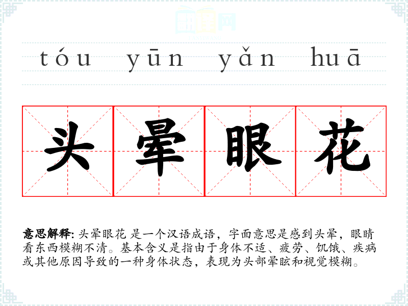 头晕眼花 是一个汉语成语,字面意思是感到头晕,眼睛看东西模糊不清。基本含义是指由于身体不适、疲劳、饥饿、疾病或其他原因导致的一种身体状态,表现为头部晕眩和视觉模糊。