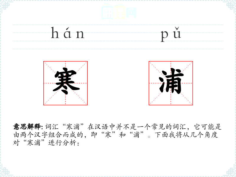 - “寒”和“浦”都是古代汉语中的常用字,组合起来形成一个新的词汇,可能在古代文学作品中有所体现,但在现代汉语中使用频率较低。