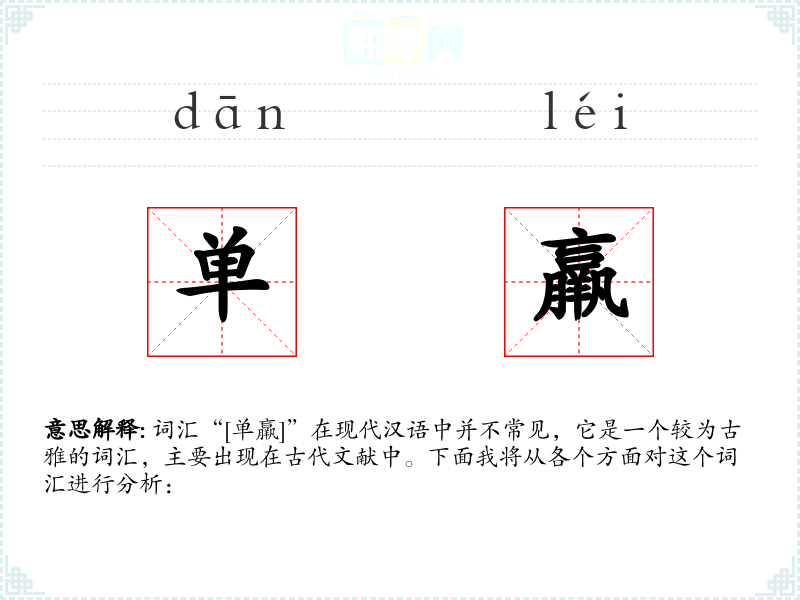 词汇“[单羸]”在现代汉语中并不常见,它是一个较为古雅的词汇,主要出现在古代文献中。下面我将从各个方面对这个词汇进行分析: