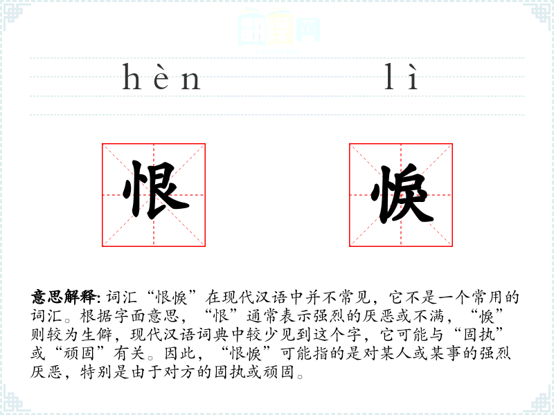 由于“恨悷”不是一个常用词汇,它在现代文学、口语或专业领域中很少出现。在古文或特定文学作品中可能会有所体现,但需要具体文本支持。