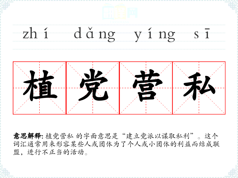 植党营私 的字面意思是“建立党派以谋取私利”。这个词汇通常用来形容某些人或团体为了个人或小团体的利益而结成联盟,进行不正当的活动。