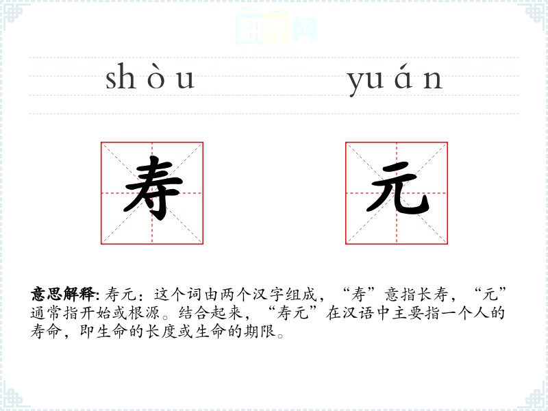 寿元:这个词由两个汉字组成,“寿”意指长寿,“元”通常指开始或根源。结合起来,“寿元”在汉语中主要指一个人的寿命,即生命的长度或生命的期限。