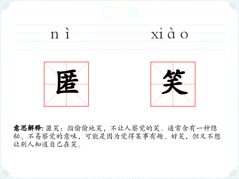 匿笑:指偷偷地笑,不让人察觉的笑。通常含有一种隐秘、不易察觉的意味,可能是因为觉得某事有趣、好笑,但又不想让别人知道自己在笑。